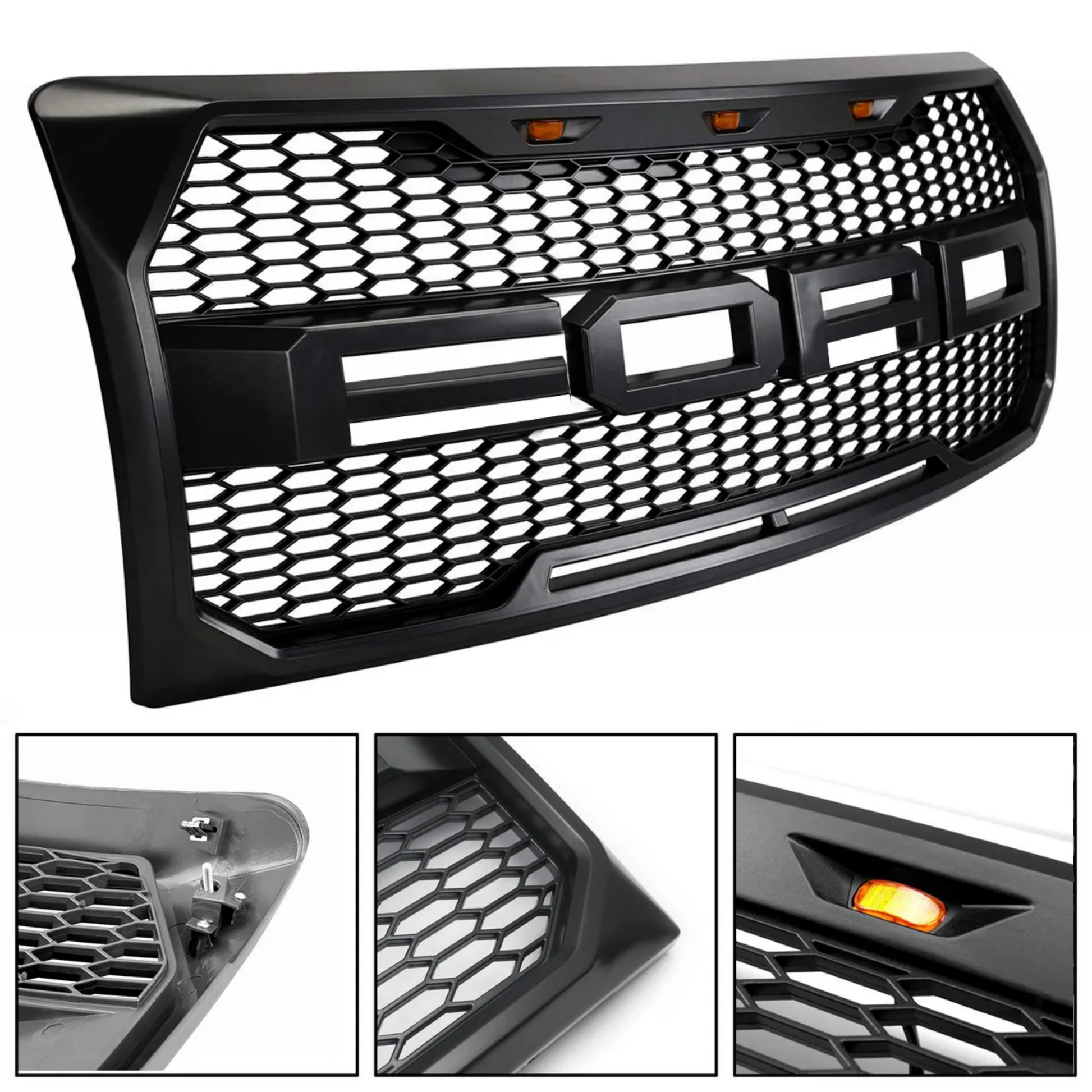 FOR 2009-2014 FORD F-150 RAPTOR STYLE Front Grille w/ Amber LED Lights & Letters