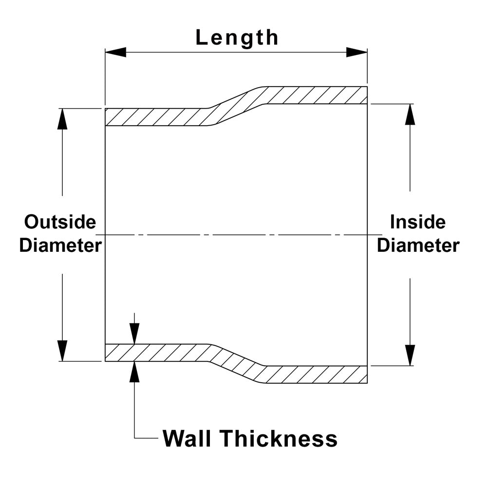 2" OD to 2" ID. Length: 4". Wall Thickness: 16 Gauge (1.65mm). HPS 6061 Aluminum Slip Fit Transition Reducer is commonly used in industrial, automotive, marine and aerospace applications. This product is ideal for custom fabrication projects such as DIY welding, high performance air intakes, cooling radiator and heater systems, turbo intercooler piping and reducing tubing setups.