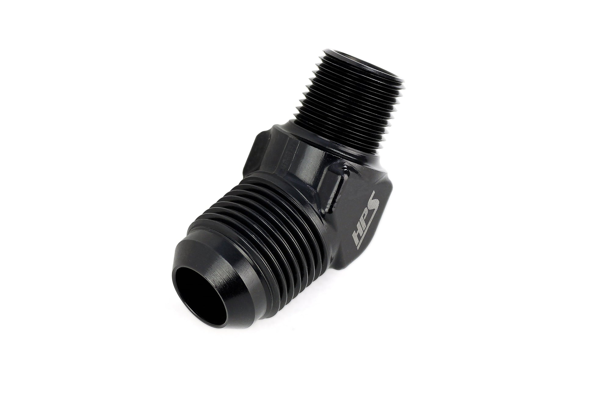 HPS Performance 45 Degree AN Flare -10 to 3/8" NPT Adapter, Aluminum, Black