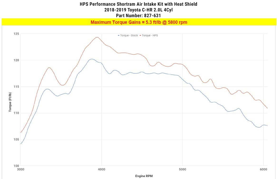 HPS Black performance shortram air intake with heat shield part number 827-631WB for 2018-2022 Toyota C-HR 2.0L offers a free-flowing 2.5" mandrel-bent aluminum tube cold air induction system designed to improve throttle response and produce dyno proven performance gains +5.9 Whp horsepower, +5.3 Ft/lbs torque while maintaining safe air fuel ratio. The heavy duty powder coated steel heat shield blocks out the heat from engine and maximize the cooling effect. The included installation manual has clear pictures and instructions to guide the installer throughout the whole process. The kit does NOT require tuning and does not trigger CEL light. No modification is required during the installation. HPS light weight 2.5" mandrel-bent aluminum alloy piping replace the stock restrictive air box and optimize the air flow with long lasting durability. HPS performance short ram air intake kit features HPS signature race proven reinforced silicone hoses and industrial grade 100% stainless steel T-bolt clamps which ensures reliability, even during the most extreme driving conditions. The All-New HPS Performance Air Filter is designed with performance in mind, delivering excellent filtration without sacrificing air flow. Washable and reusable. All HPS Performance Air Filters are made in the United States and backed by HPS One-Year Limited Warranty. NOT CARB Complaint. This HPS intake is designed for 2018-2022 Toyota C-HR 2.0L.