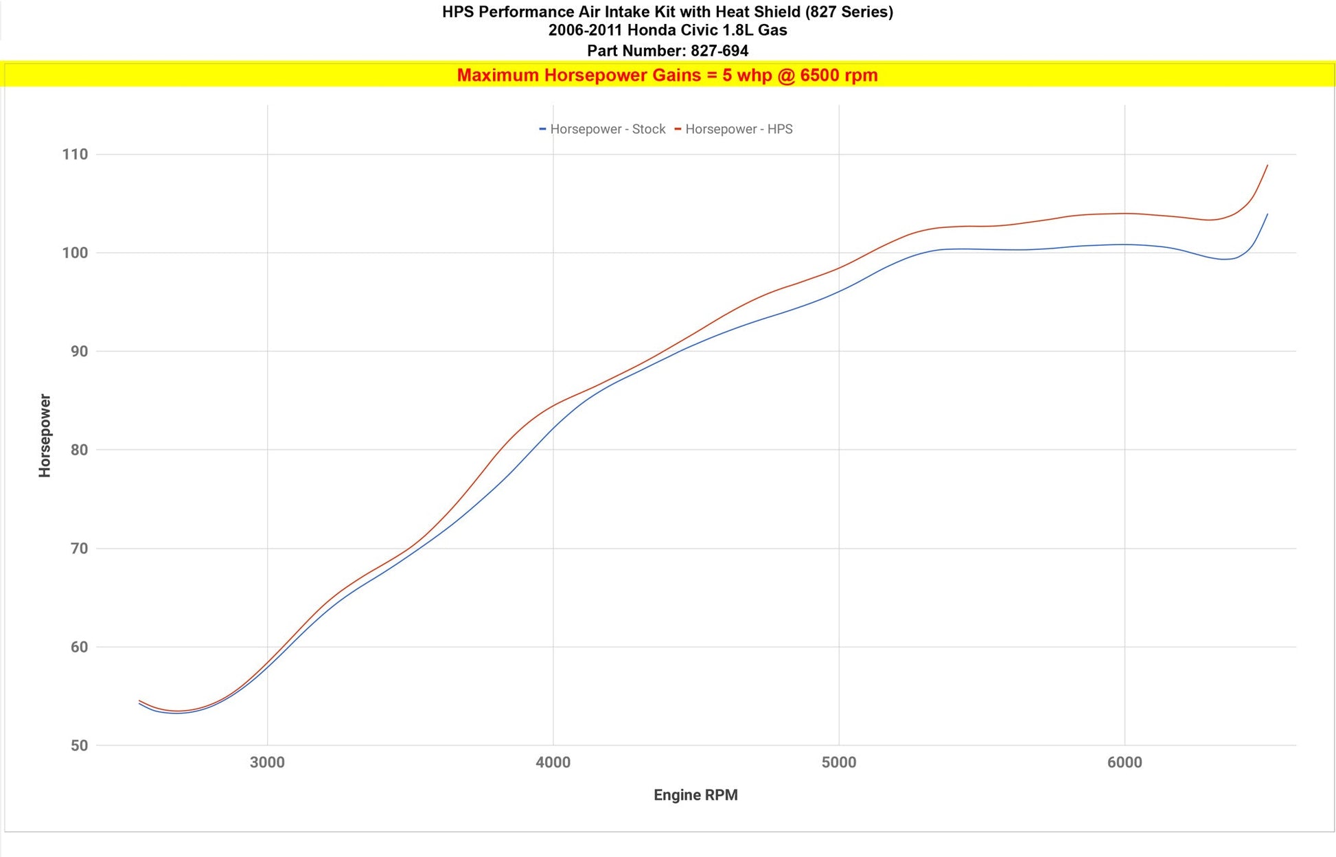 HPS Performance Air Intake Kits are designed with style and performance in mind. This HPS Performance Air Intake Kit replaces the factory intake and air filter housing with a 2.75" custom mandrel-bent aluminum tube and heavy duty powder coated heat shield designed to maximize performance. It includes a reusable high-flow cotton air filter to provide maximum airflow to increase the engine's output by up to 5 horsepower and 4.7 lb-ft. of torque for power that's felt through improved throttle response and acceleration. This kit includes HPS 100% stainless steel T-bolt clamps and a silicone reducer that are engineered to withstand the toughest driving conditions. HPS Performance Air Intake Kits are designed and tested using the latest technology to ensure the best performance and fitment.
