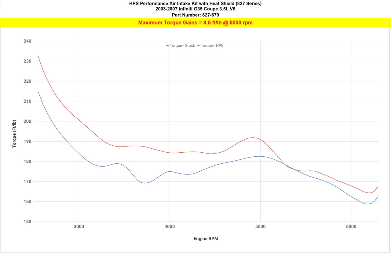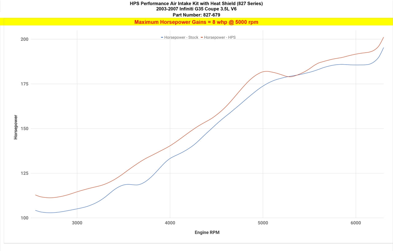 HPS Performance Air Intake Kits are designed with style and performance in mind. This HPS Performance Air Intake Kit replaces the factory intake and air filter housing with a 3.25" custom mandrel-bent aluminum tube and heavy duty powder coated heat shield designed to maximize the performance of your vehicle. It includes a reusable high-flow cotton air filter to provide maximum airflow to increase your engine's output by up to 8 horsepower and 8.5 lb-ft. of torque for power you can feel through improved throttle response and acceleration. This kit includes both HPS 100% stainless steel T-bolt clamps and 3-ply reinforced silicone couplers that are engineered to withstand the toughest driving conditions. HPS Performance Air Intake Kits are designed and tested using the latest technology to ensure the best performance and fitment.