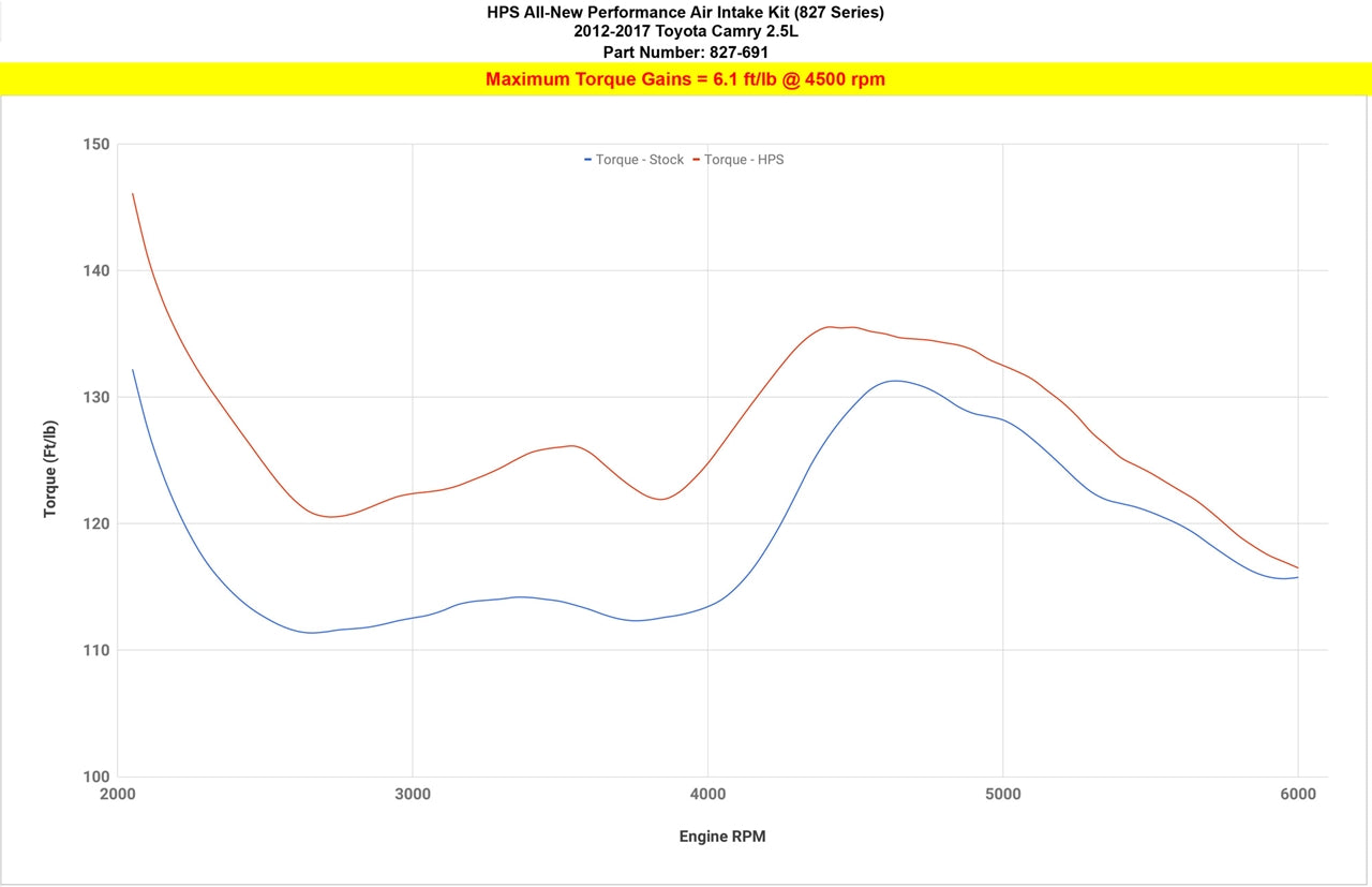 HPS Performance Air Intake Kits are designed with style and performance in mind. This HPS Performance Air Intake Kit replaces the factory intake and air filter housing with a 3" custom mandrel-bent aluminum tube and heavy duty powder coated heat shield designed to maximize the performance of this vehicle. The heat shield integrates with the factory air scoop and features a lid to keep intake air temperatures cool. It also includes a reusable high-flow cotton air filter to provide maximum airflow to increase the engine's output by up to 9.5 horsepower and 6.1 lb-ft. of torque for power that's felt through improved throttle response and acceleration. This kit features both HPS 100% stainless steel T-bolt clamps and a silicone coupler that are engineered to withstand the toughest driving conditions. HPS Performance Air Intake Kits are designed and tested using the latest technology to ensure the best performance and fitment.