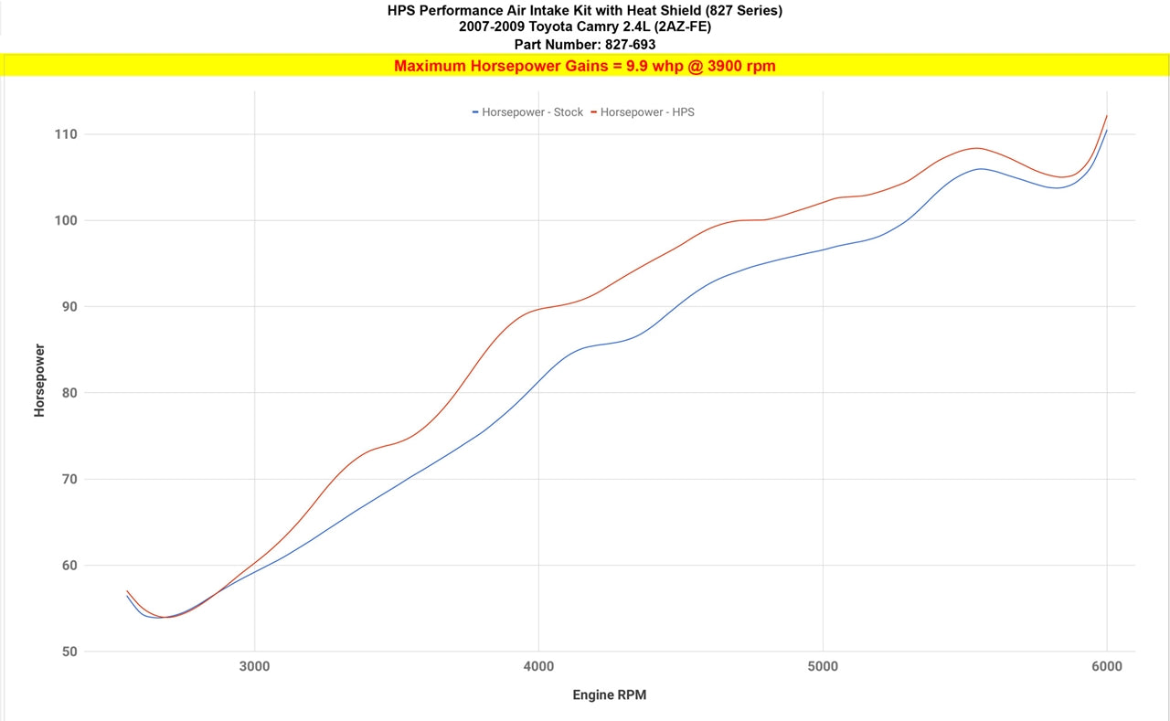 HPS Performance Air Intake Kits are designed with style and performance in mind. This HPS Performance Air Intake Kit replaces the factory intake and air filter housing with a 3" custom mandrel-bent aluminum tube and heavy duty powder coated heat shield designed to maximize the performance of this vehicle. The heat shield integrates with the factory air scoop and features a lid to keep intake air temperatures cool. It also includes a reusable high-flow cotton air filter to provide maximum airflow to increase the engine's output by up to 9.9 horsepower and 13.3 lb-ft. of torque for power that's felt through improved throttle response and acceleration. This kit features both HPS 100% stainless steel T-bolt clamps and a silicone reducer coupler that are engineered to withstand the toughest driving conditions. HPS Performance Air Intake Kits are designed and tested using the latest technology to ensure the best performance and fitment.