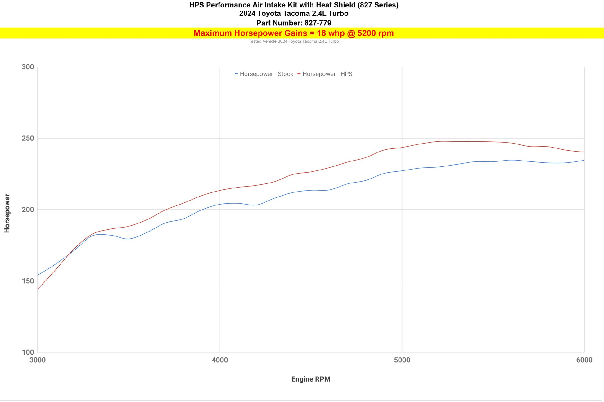 This HPS Performance Air Intake Kit upgrades the stock intake and air box to uncover your engine’s untapped power potential. Dyno-tested and proven, this system delivers a substantial power boost of 18 horsepower and 18.2 lb-ft of torque. Feel the difference with sharper throttle response and reduced turbo lag, transforming your daily drive into an exhilarating experience. The 3" intake pipe replaces the restrictive factory plastic intake hose with a smooth, mandrel-bent aluminum pipe, allowing your engine to breathe freely and efficiently. This upgrade not only optimizes airflow but also enhances the overall sound of your Tacoma's engine. The kit includes a robust 3-ply reinforced high-temperature resistant silicone coupler, corrosion-resistant stainless steel embossed hose clamps, and a premium, washable, reusable 4-ply pre-oiled cotton air filter to guarantee optimal performance and longevity. Featuring an open-top design with a secondary cone, the HPS Dual-Cone Air Filter enhances airflow efficiency. Air entering from the truck's air duct directly accesses the top of the filter. This eliminates the detours and restrictions imposed by closed-top filters, allowing for more efficient air delivery to the engine. To keep intake air temperatures at bay, this kit includes a 3-piece heat shield that seamlessly integrates into your engine bay for a clean, high-performance look. Designed to simply bolt on and run, HPS Performance intake kits do not require a tune or any additional modifications to achieve more power. All it takes are simple hand tools and this easy-to-install kit to maximize your truck’s capabilities. Upgrade to the HPS Performance Air Intake Kit and experience the perfect blend of power, durability, and style for your turbocharged truck.