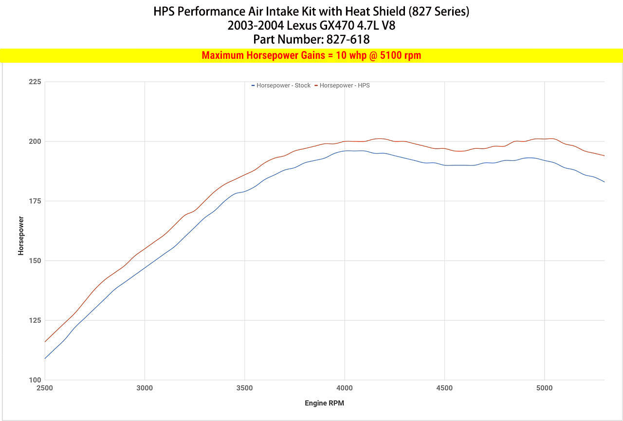HPS polish performance shortram air intake with heat shield part number 827-618P for 2003-2004 Lexus GX470 4.7L V8 offers a free-flowing 3.5" mandrel-bent aluminum tube cold air induction system designed to improve throttle response and produce dyno proven performance gains +6.5 Whp horsepower, +6.1 Ft/lbs torque while maintaining safe air fuel ratio. The heavy duty powder coated steel heat shield blocks out the heat from engine and maximize the cooling effect. The included installation manual has clear pictures and instructions to guide the installer throughout the whole process. The kit does NOT require tuning and does not trigger CEL light. No modification is required during the installation. HPS light weight 3.5" mandrel-bent aluminum alloy piping replace the stock restrictive air box and optimize the air flow with long lasting durability. HPS performance short ram air intake kit features HPS signature race proven reinforced silicone hoses and industrial grade 100% stainless steel T-bolt clamps which ensures reliability, even during the most extreme driving conditions. The All-New HPS Performance Air Filters are made in the United State and are designed with performance in mind, delivering excellent filtration without sacrificing air flow. Washable and reusable. NOT CARB Complaint. Vehicle Application: 2003-2004 Lexus GX470 4.7L V8