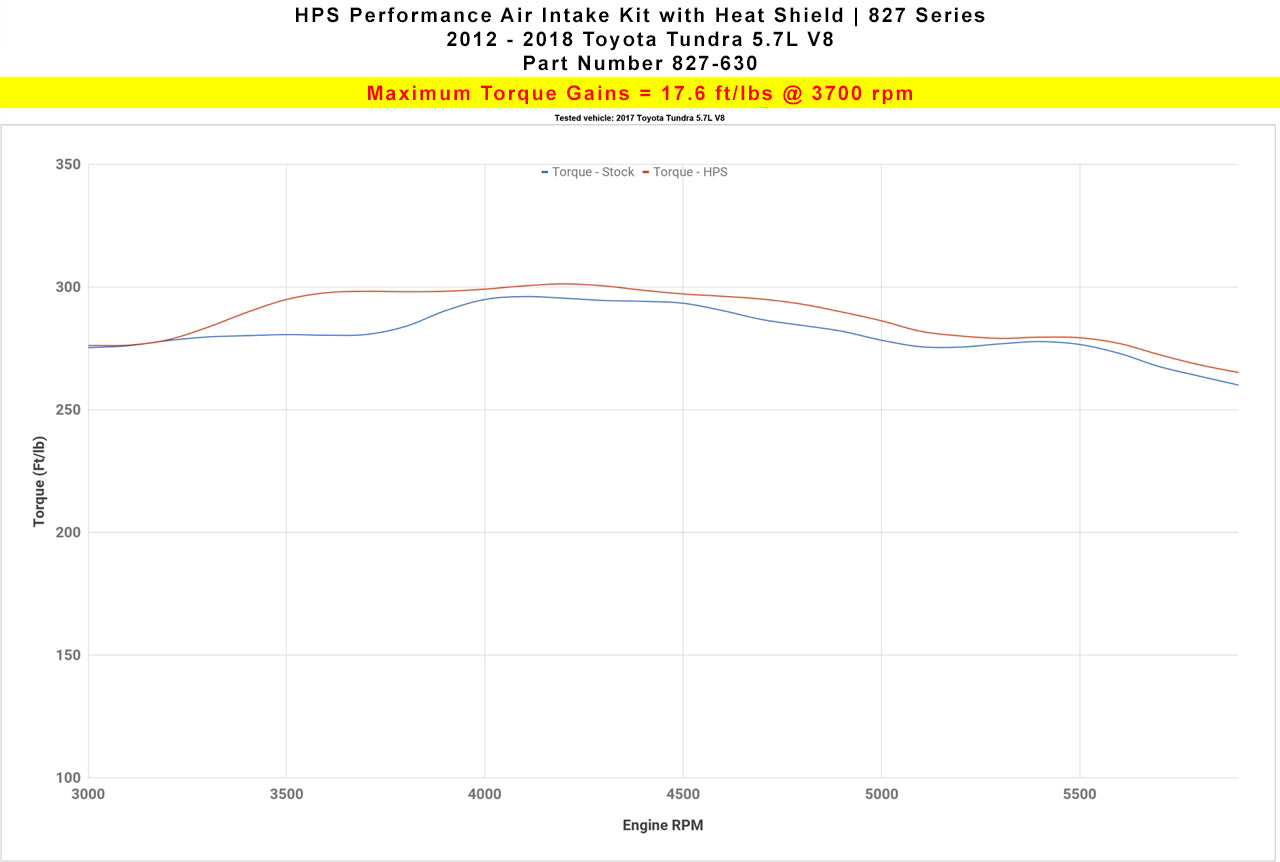 The All-New HPS Performance 827 Series Air Intake Kit (Polish, Part # 827-630P) for 2012-2019 Toyota Tundra 5.7L V8 offers a free-flowing 4 inch mandrel-bent aluminum tube induction system designed to produce dyno proven performance gains - increase horsepower +12.4 whp , torque +17.6 ft/lbs and improve throttle response while maintaining safe air fuel ratio. The heavy duty powder coated steel heat shield blocks hot air from the air filter for the best cooling effect. The included installation manual has clear pictures and instructions to guide the installer throughout the whole process. The kit does NOT require tuning and does not trigger CEL light. No modification is required during the installation. HPS light weight mandrel-bent aluminum alloy tube replaces the stock restrictive air box and optimize the air flow with excellent heat dissipation and long lasting durability. HPS Performance 827 Series air intake kit features race proven reinforced silicone hoses and industrial grade 100% stainless steel T-bolt clamps which ensures reliability, even during the most extreme driving conditions. The All-New HPS Performance Air Filter is designed with performance in mind, delivering excellent filtration without sacrificing air flow. All HPS Performance Air Filter are made in the United States.