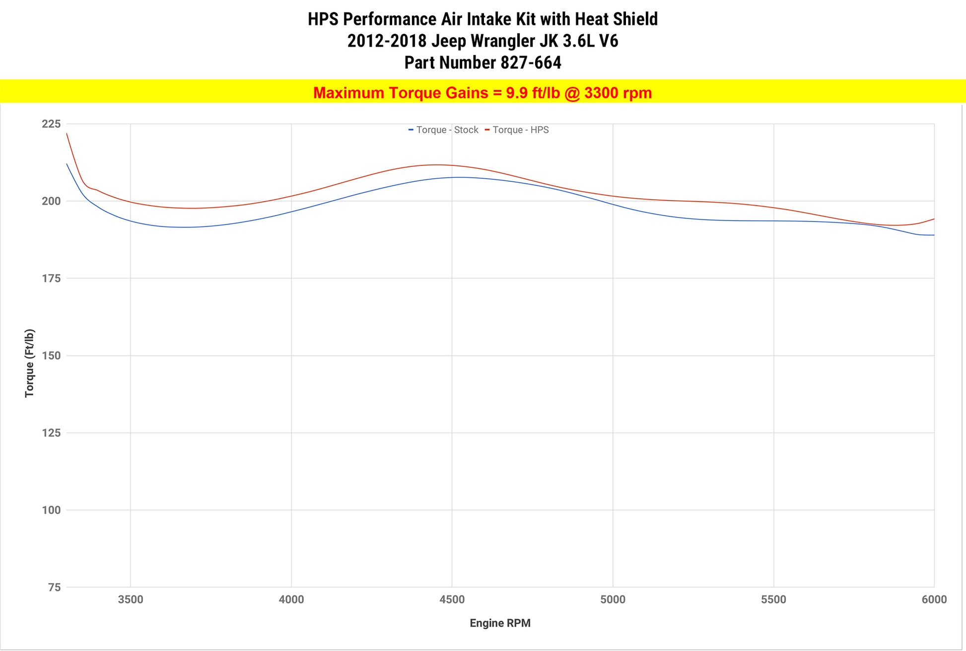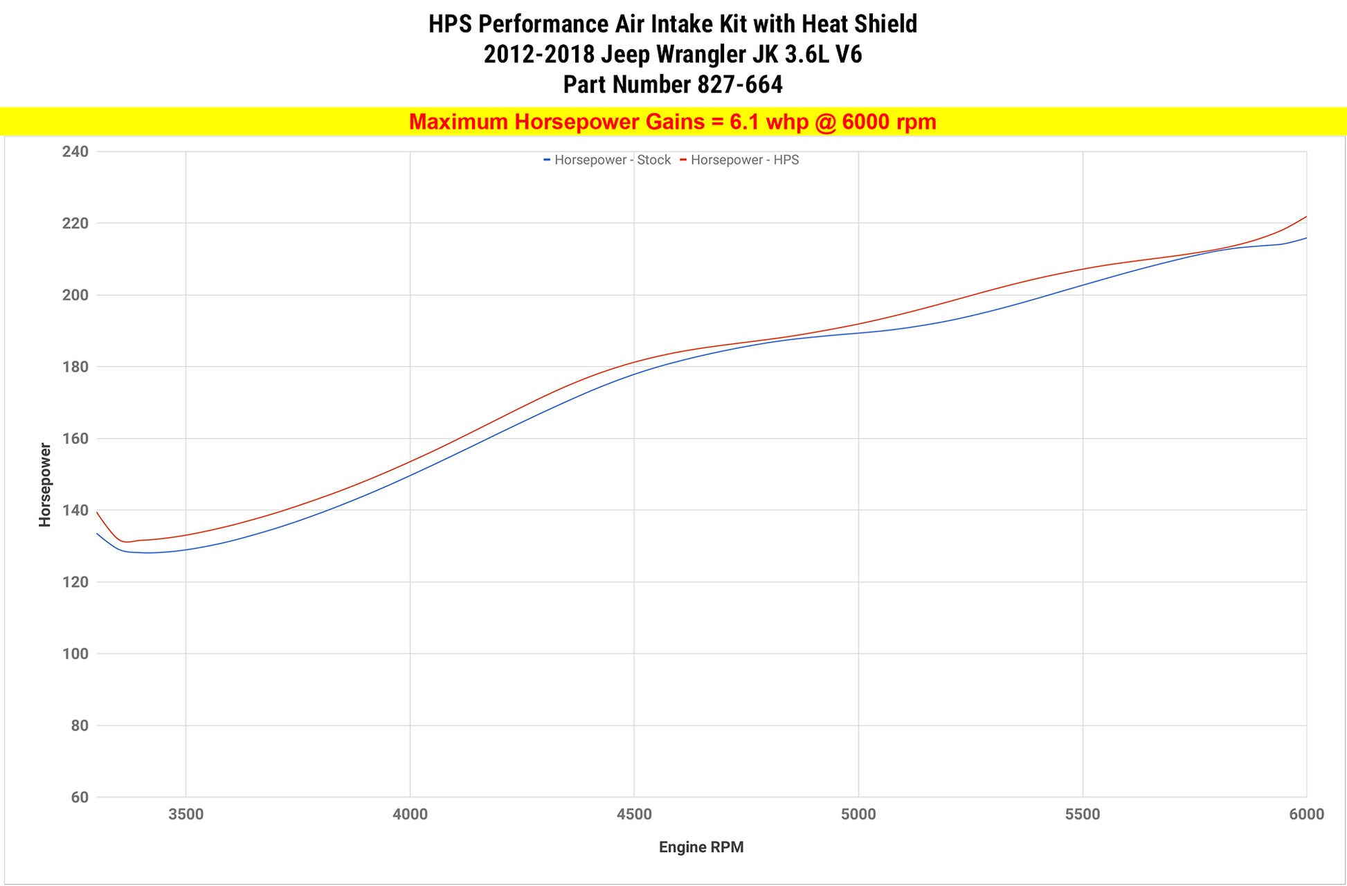 HPS red performance cold air intake with heat shield part number 827-664R for 2012-2018 Jeep Wrangler JK 3.6L V6 offers a free-flowing 3.25" mandrel-bent aluminum tube induction system designed to improve throttle response and produce dyno proven performance gains +6.1 Whp horsepower, +9.9 Ft/lbs torque while maintaining safe air fuel ratio. The heavy duty powder coated steel heat shield included in the kit blocks out the heat from engine and maximize the cooling effect. The included installation manual has clear pictures and instructions to guide the installer throughout the whole process. The kit does NOT require tuning and does not trigger CEL light. No modification is required during the installation. HPS light weight 3.25" mandrel-bent aluminum alloy piping replace the stock restrictive air box and optimize the air flow with long lasting durability. HPS performance cold air intake kit features HPS signature race proven reinforced silicone hoses and industrial grade 100% stainless steel T-bolt clamps which ensures reliability, even during the most extreme driving conditions. The All-New HPS Performance Air Filters are made in the United State and are designed with performance in mind, delivering excellent filtration without sacrificing air flow. Washable and reusable. NOT CARB Complaint. Vehicle Application: 2012-2018 Jeep Wrangler JK 3.6L V6