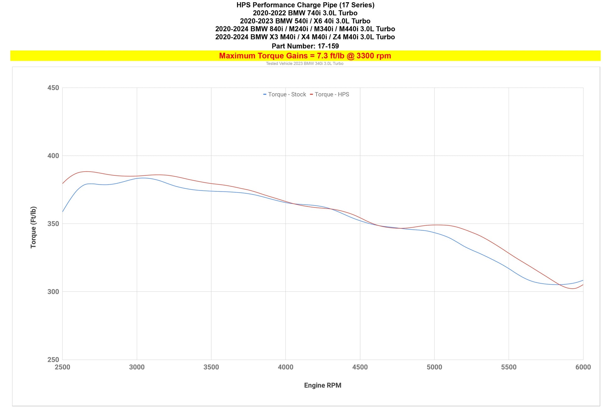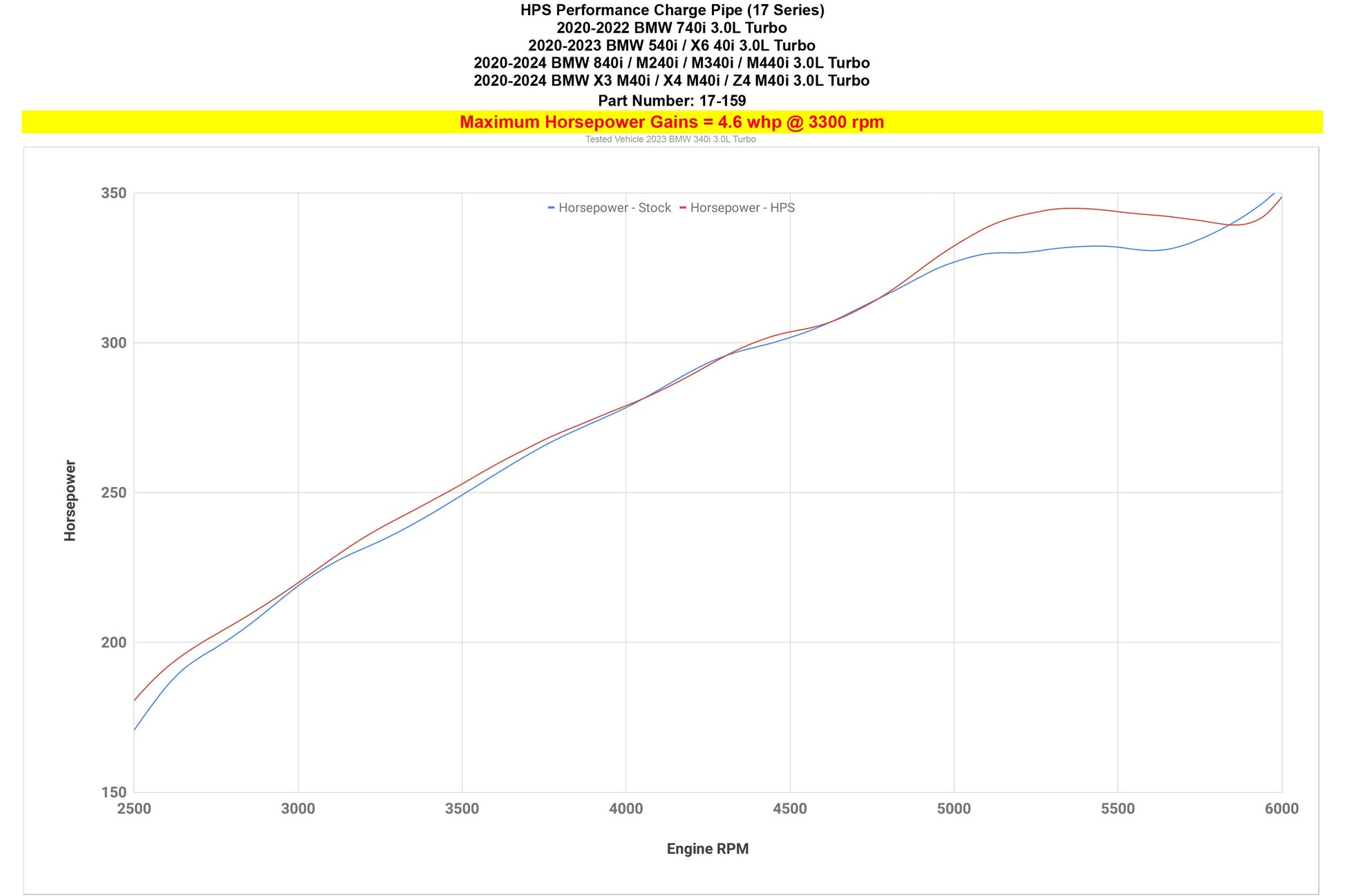 The HPS Performance Charge Pipe Kit is engineered to deliver more power and responsiveness, boasting dyno-proven gains of 4.6 horsepower and 7.3 lb-ft. of torque. Crafted for optimal air flow, this charge pipe kit features smooth 3” to 2.25" bead-rolled aluminum piping that outdoes the stock plastic piping in both performance and durability. The high-temperature and high-pressure resistant 3-ply reinforced silicone reducer coupler ensures a secure and long-lasting connection between the two pipes, while the 100% stainless steel embossed hose clamps guarantee a leak-free installation. Designed to seamlessly replace the stock piping, this kit integrates into your BMW’s engine bay without requiring any additional modifications or tunes. The included 1/8" NPT bung provides a convenient port for future upgrades, while the upgraded billet aluminum quick connect adapter streamlines the installation process. This charge pipe kit is the perfect fusion of performance, durability, and ease of installation. Whether you’re dominating the track or cruising the streets, this upgrade is a must for those seeking to elevate their driving experience.