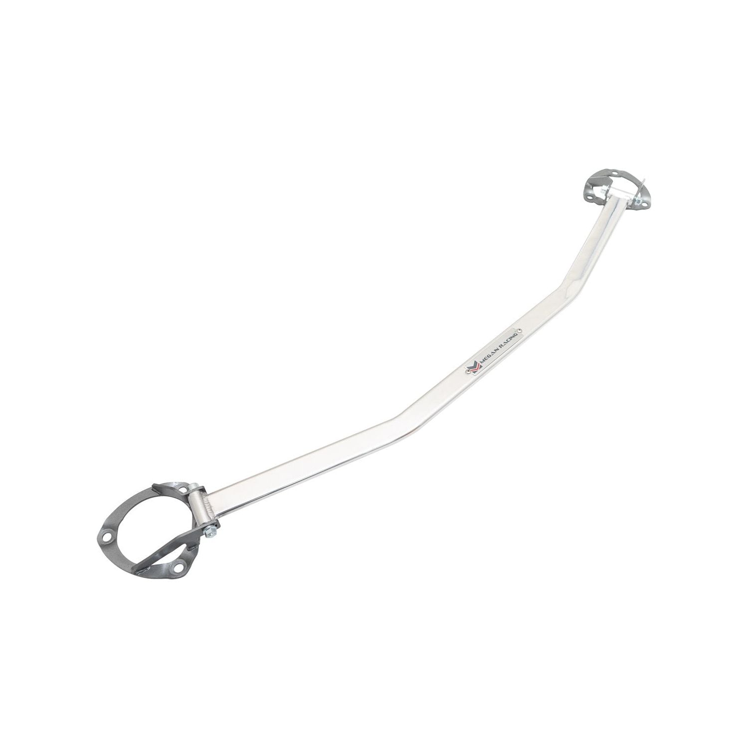 One-Piece Race Spec Strut Tower Bar constructed of strong Aluminum to extremely tight tolerances and then polished to perfection. This bar ties the chassis from left to right at critical stress points (Between the shock/strut towers) to decrease body roll
