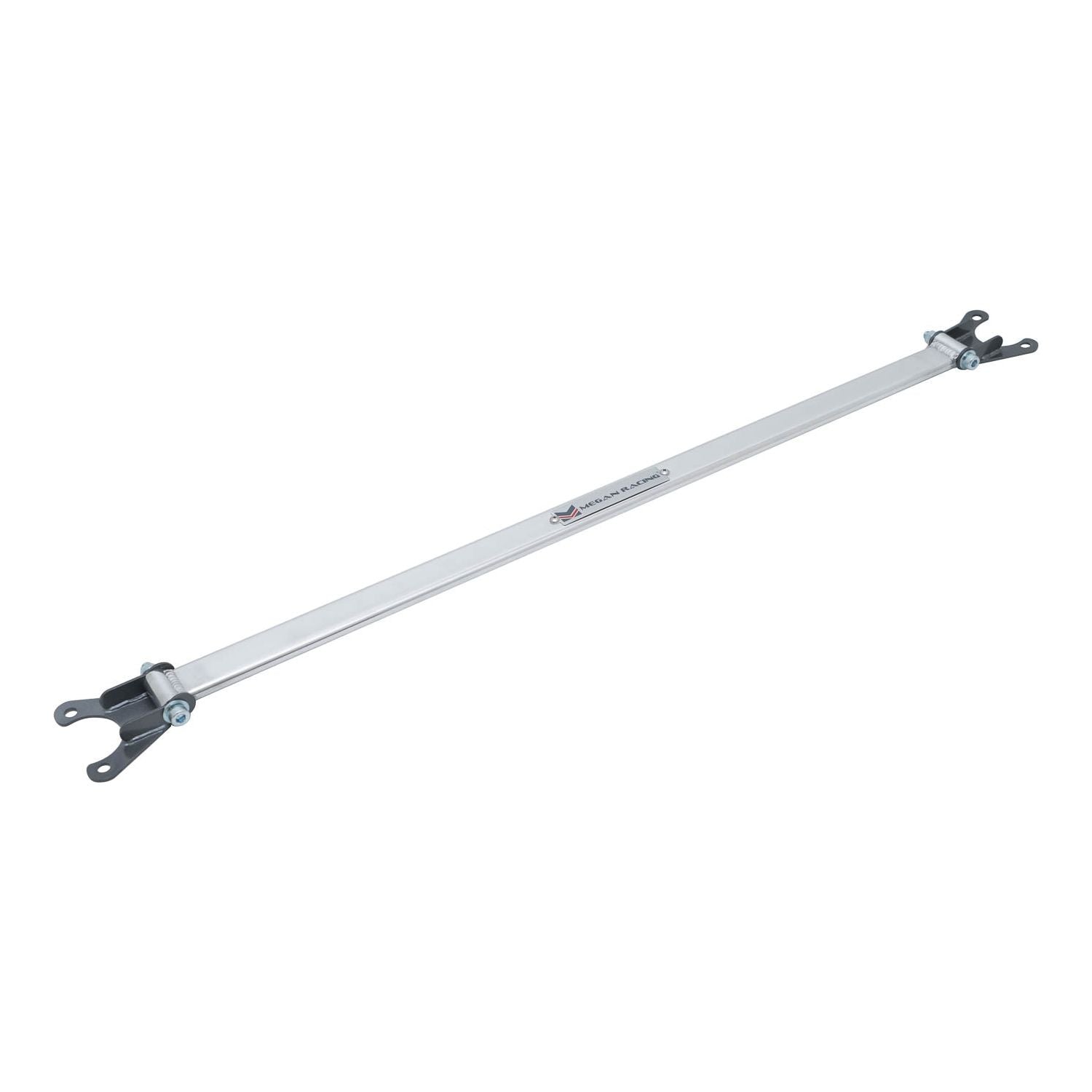 One-Piece Race Spec Strut Tower Bar constructed of strong Aluminum to extremely tight tolerances and then polished to perfection. This bar ties the chassis from left to right at critical stress points (Between the shock/strut towers) to decrease body roll
